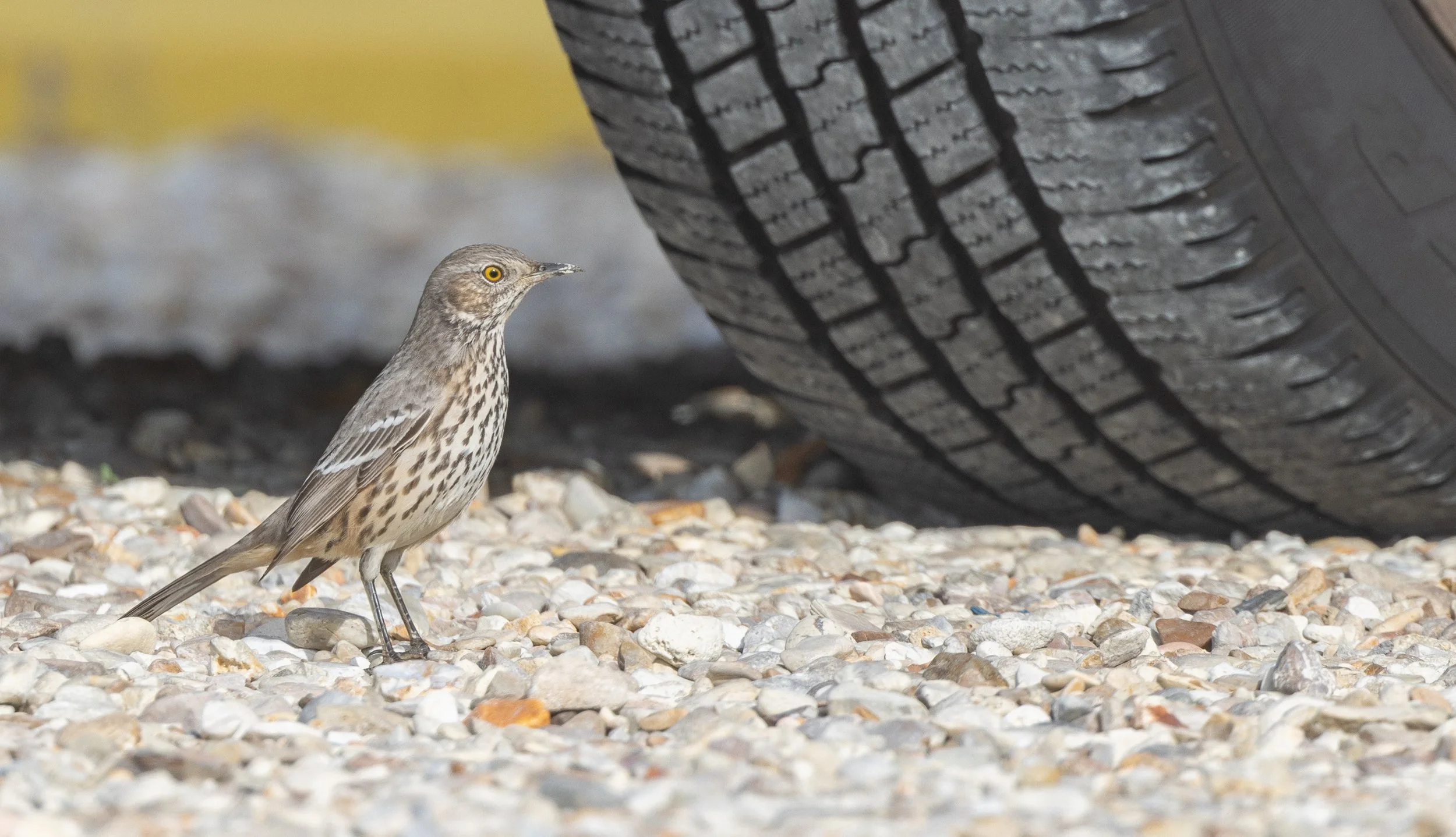 It was only a few minutes before Van found the bird hopping between two trucks. Stoked, we all got crushing photos of the birds hopping on the ground and got some laughs and questions from bar-goers. Everyone was friendly and they helped us relocate the bird when it would fly to other parts of the parking lot. At one point, it did get very close to the bar cat, and an employee came out to wrangle the cat away from the thrasher.