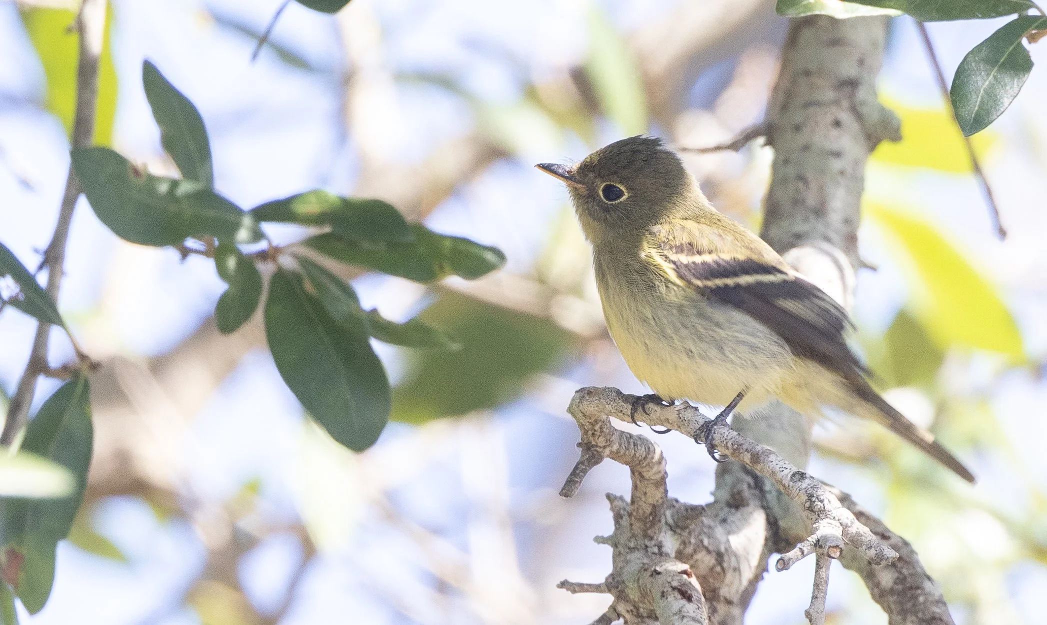 The probable Western Wood-Pewee sporting a muted upper wingbar and a nearly black lower mandible. The overall darkness of the plumage alone is striking.