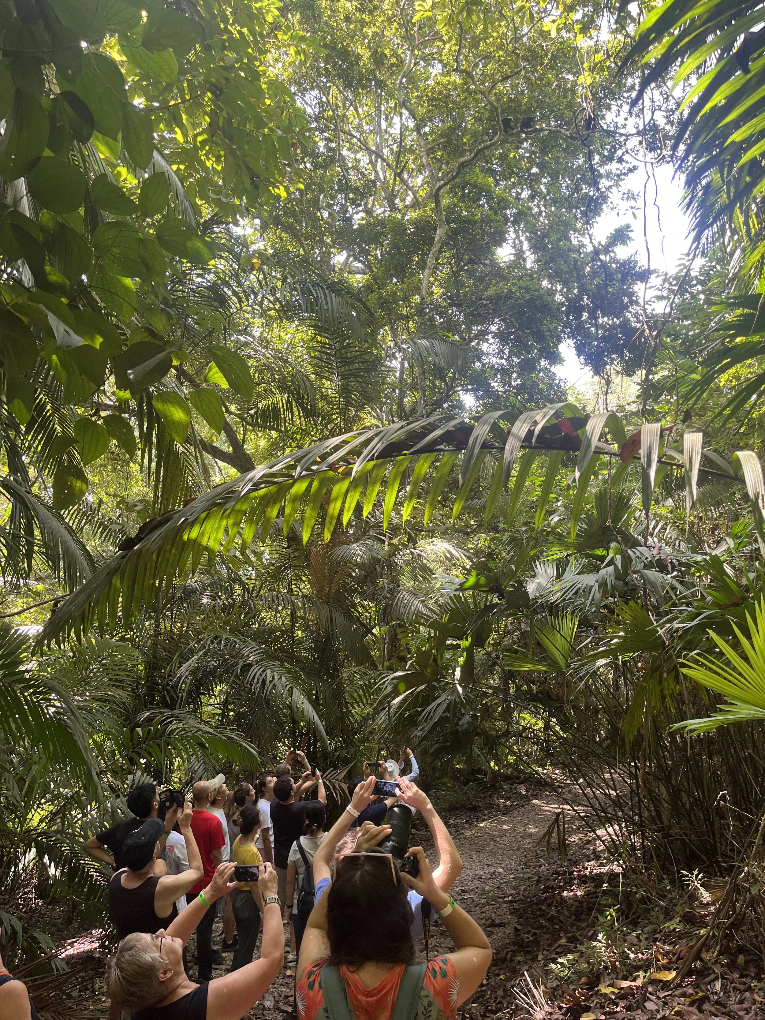 After the toucans, I encountered a couple quietly photographing something in the canopy. They’d spotted a Mantled Howler Monkey but it was far off. People stopped in the trail to see what we were looking at, and I got them on the monkey. Again, I passed my binoculars around. I had to give a demonstration on turning the focus knob - something that many non-birders have never encountered. As we watched, the rest of the troop of monkeys came into view. Almost silently, the only noise the swooshing of leaves and branches above us, about 15 monkeys swung into view, eventually stopping in the trees just over the trail. There were a few young monkeys, including one tiny guy clambering around the trees and riding on his mothers back. About 25 people ended up standing around, enjoying their Christmas monkey experience. Some of those standing just under the monkeys got a more memorable gift when a young monkey started peeing from the canopy.